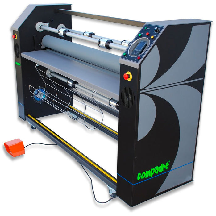 The Compadre is an entry level laminator designed to satisfy the small to medium sign shop market. This laminator incorporates AGL’s original nip roll design and configuration with a maximum working width of 64 inches. The Compadre allows for more reliable print laminating and mounting at faster throughput speeds up to 20 fpm. It features a six inch nominaldiameter steel non-crowned silicone covered nip roll assembly with gap adjustment from -1/16 to ¾” inch. AGL’s rollers are straight and concentrically ground to yielding less print distortion and wrinkling. The heated top nip roll features preset heat assist for warming up pressure sensitive over-laminates resulting in a perfectly smooth output. The rollers are made of high release silicone for easy cleaning. The Compadre comes standard with two unwind supply shafts, one finished product windup shaft and one release liner windup.