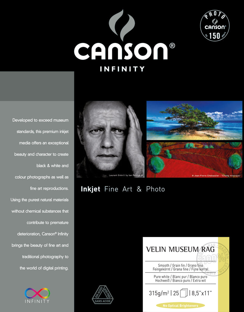 Canson favors the use of natural minerals and the purest materials to offer age-resistant inkjet papers. Canson's Inkjet Fine Art and Photo papers and canvas present exceptional quality and character combined with stellar printing performance, consistency and value. Canson Infinity papers and canvas provide a wide color gamut, deep blacks and excellent image sharpness.