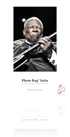 Photo Rag Satin bestows fine art reproductions and photographs with a soft sheen. It renders mirror and gloss effects particularly well. The unprinted areas remain matt.