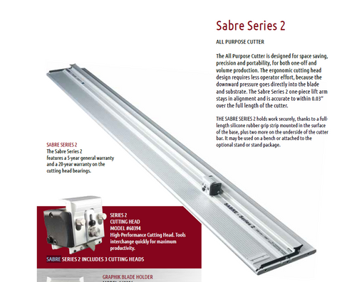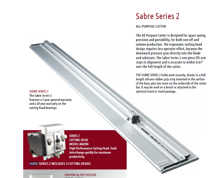 The All Purpose Cutter is designed for space saving, precision and portability, for both one-off and volume production. The ergonomic cutting head design requires less operator effort, because the downward pressure goes directly into the blade and substrate. The Sabre Series 2 one-piece lift arm stays in alignment and is accurate to within 0.03” over the full length of the cutter.